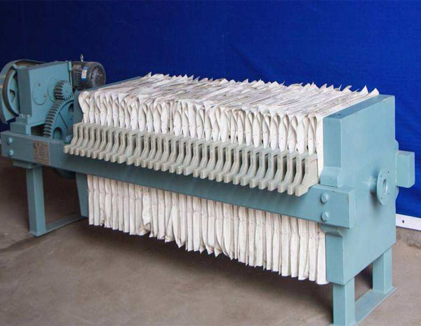 压滤机主要由三大部分组成,即:机架部分、过滤部分、压紧装置。压滤机工作时,转动手轮,通过小齿昏、大齿轮,带动丝杠推动压紧板,将位于压紧板和止推板之间的滤板和过滤介质(滤布)压紧,以保证带有工作压力的被过滤物料(料浆)在滤室内进行加压过滤。(1)机架部分:机架构成压滤机的基础,用以支撑过滤机构、连接其它部件。它主要由止推板、压紧板、压紧部分和主梁组成。(2)过滤部分:是由以次序排列在主梁上的滤板和夹在滤板之间的过滤介质(滤布)组成,形成一个个过滤单元(滤室)。(3)压紧部分:它是压滤机的动力装置,主要部件有小齿昏、大齿轮、丝杠等。整机结构设计合理,性能稳定可靠,操作简单,维修方便,适用范围广,是悬浮液分离的理想设备。
